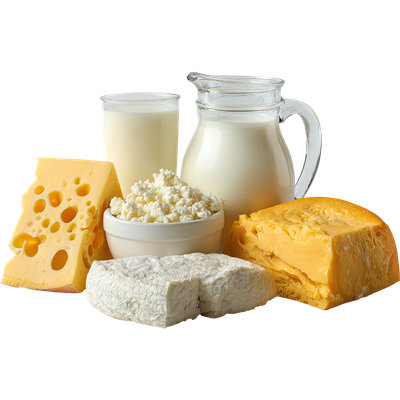 Milk, ghee, curd, paneer, and dairy derivatives for sweet production.